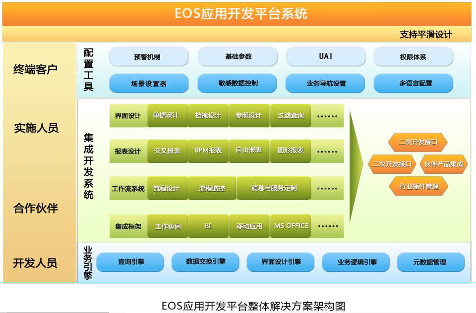 EOS是建立在各種標(biāo)準(zhǔn)的技術(shù)平臺(tái)之上的開(kāi)發(fā)平臺(tái),EOS是基于標(biāo)準(zhǔn)的(如J2EE、XML、WFMC)。EOS支持100%的B/S應(yīng)用結(jié)構(gòu),作為核心開(kāi)發(fā)平臺(tái),EOS包含工作流引擎平臺(tái)、企業(yè)門(mén)戶(hù)平臺(tái)、集成平臺(tái)等。